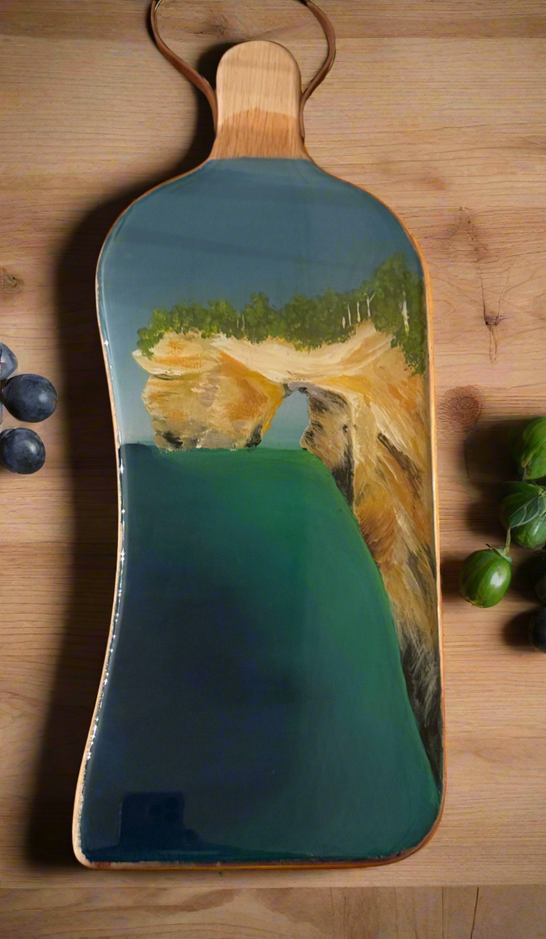Where the sandstone cliffs meet the rolling waves, Cliff & Currents is born. This hand-painted charcuterie board is a striking tribute to Lovers Leap at Pictured Rocks, created in collaboration with artisan Hannah Kruzinski. The board’s unique curved silhouette echoes the natural formations of the shoreline, while a leather strap-accented handle adds a rustic, functional finish.